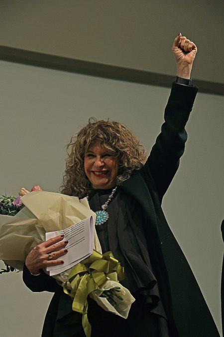La secretaria de Cultura del Gobierno de México, Claudia Curiel de Icaza; el rector de la UNAM, Leonardo Lomelí Vanegas, la periodista Silvia Lemus y la poeta Natalia Toledo, en representación del jurado, entregaron el reconocimiento a la autora de “Un silencio lleno de murmullos”.